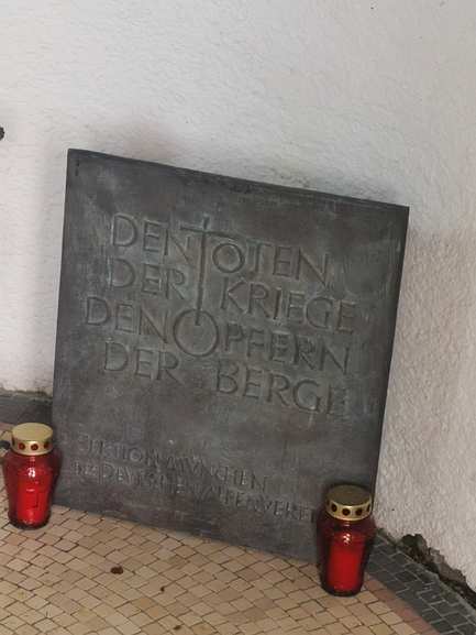 Eine lose stehende Bronzeplatte verweist auf die Sektion München des Deutschen Alpenvereins.