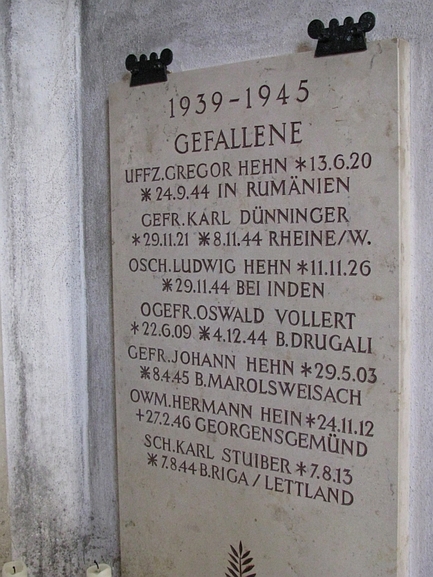 Gefreiter | HEHN | Johann | 29.05.1903 | 08.04.1945 b. Marolsweisach | Kriegsgräberstätte in Treuchtlingen am Nagelberg: Feld 5 Grab 176 | |