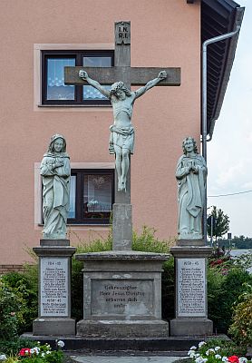 Sockel mit Steinkreuz, daneben zwei Gedenksteine mit Steinfiguren.