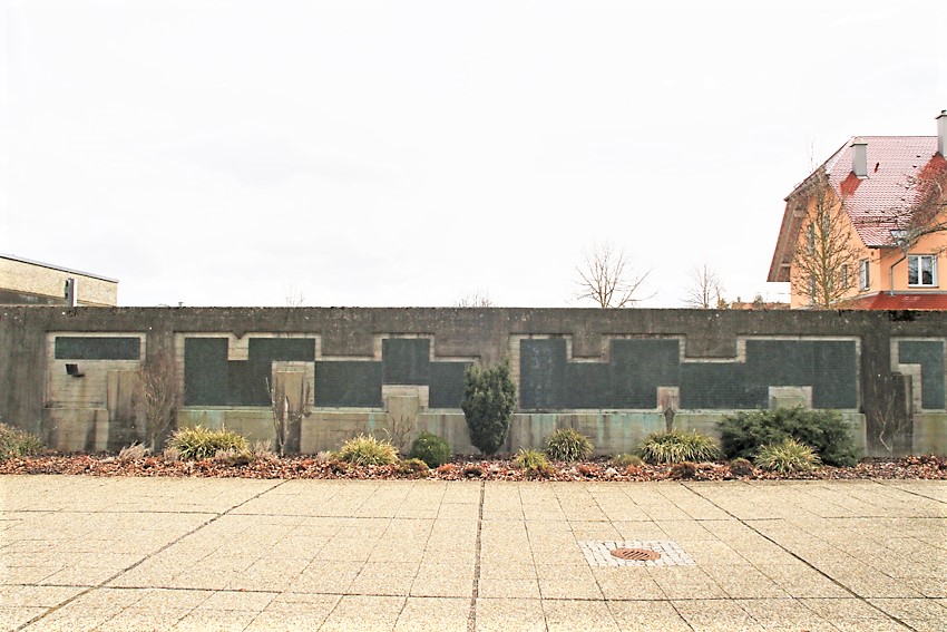 Wandplaketten beim Friedhof. Versetzt angeordnete Metalltafeln mit den Namen der Gefallenen.