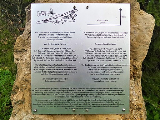 Weiterer Text auf der Tafel: Wir gedenken hier der gefallenen Flieger der NN 758, die ihr Leben im Kampf gegen die verbrecherische Gewaltherrschaft der Nationalsozialisten