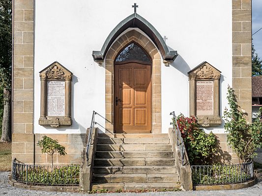 Außen an der Kapelle Maria Geburt, neben dem Eingang, befinden sich zwei Gedenktafeln, die mit Säulen und einem Dach verziert sind.