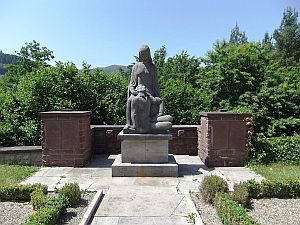 Steinsockel, darauf eine Frau mit einem sitzenden Mann.