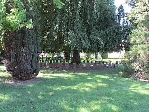 Auf dem Friedhof wurden Grabsteine kreisförmig um einen Baum herum zu einem Ehrenhain gruppiert. Dort wird der Opfer des Zweiten Weltkrieges gedacht.