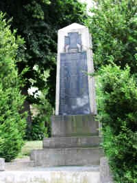 Auf der Vorderseite eines Obelisken die Gedenktafel mit den 25 Namen der Kriegstoten des Ersten Weltkrieges.