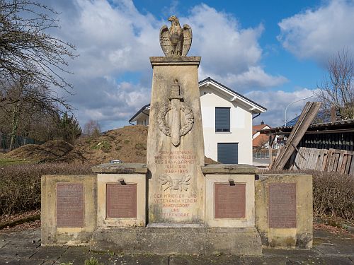 Steinsäule mit krönendem Adler, vorne ein Schwert auf Lorbeerkranz.