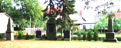 Auf dem Gelände der Kirche steht eine Gruppe von Denkmalen. Ein Obelisk erinnert an den Hauptmann Ruhe, Teilnehmer der Freiheitskriege und an der Schlacht von Waterloo, ein weiterer Obelisk an die Gefallenen des Deutsch-Französischen Krieges, ein großer Feldstein mit metallener Namenstafel an die Gefallenen des Ersten Weltkrieges und zwei kleinere glatte Steine mit ebenfalls metallener Namenstafel an die Gefallenen des Zweiten Weltkrieges.