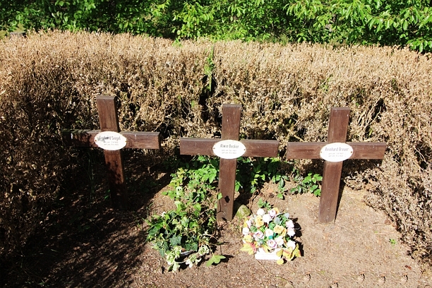 Drei Holzkreuze und Informationstafel