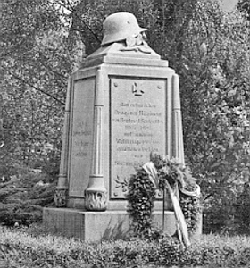 Abgestufter Quader mit Inschriften an den Seiten und nach unten ragenden Fackeln an den Ecken, gekrönt von einer Stahlhelm-Plastik (abgerissen).