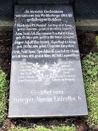 Auf der liegenden Tafel (Erster Weltkrieg) sind Pickelhaube, gekreuzte Gewehre, Eichen- und Lorbeerkranz abgebildet.