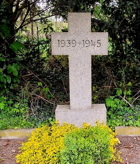 Ein weißes Steinkreuz mit den Jahreszahlen kennzeichnet die kleine Kriegsgräberstätte.