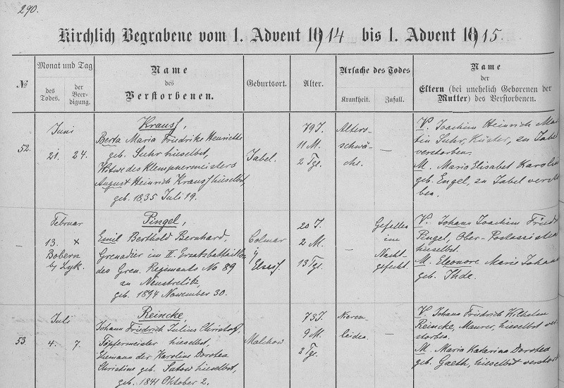 Heeresdienst | Arbeiter in Petersdorf, Lungenentzündung, Ehefr. Karol. Sophie Marie geb. Brunswig | |