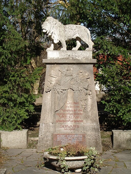 Sandsteinlöwe auf Gedenkstein (1870/71) mit zusätzlicher Tafel für den Zweiten Weltkrieg.