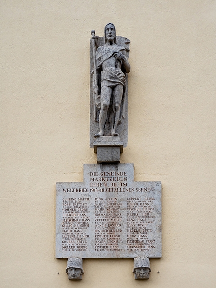 Eine Christus-Figur, darunter eine Gedenktafel, an der Außenseite der Kirche St. Michael.