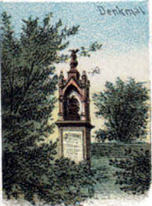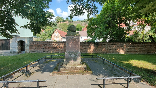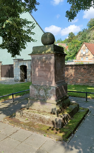 An der Straße, unweit der Kirche, freistehendes Denkmal. Mehrgliedriger großen Sockelbereich, auf dem ein quadratischer Sandsteinblock aufgesetzt ist. Dieser ist auf allen vier Seiten verziert und mit Inschriften versehen.