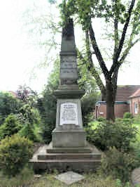 Mehrstufiger verzierter Sandsteinobelisk auf zweistufigem Klinkersockel.