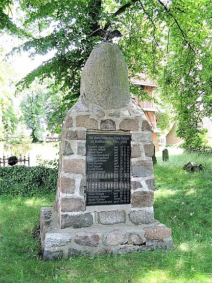 An dem Sockel eine Tafel mit Namen. Auf dem Findling ein Adler mit ausgebreiteten Schwingen, darunter eine nicht mehr leserliche Inschrift.