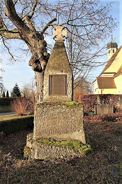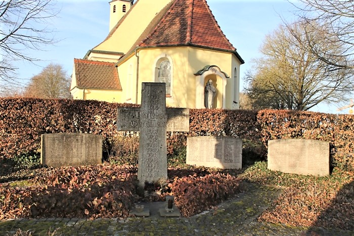 Das Denkmal mit Säule, Kreuz und drei Steinen befindet sich auf der Ostseite des Friedhofes vor der Marienkapelle.