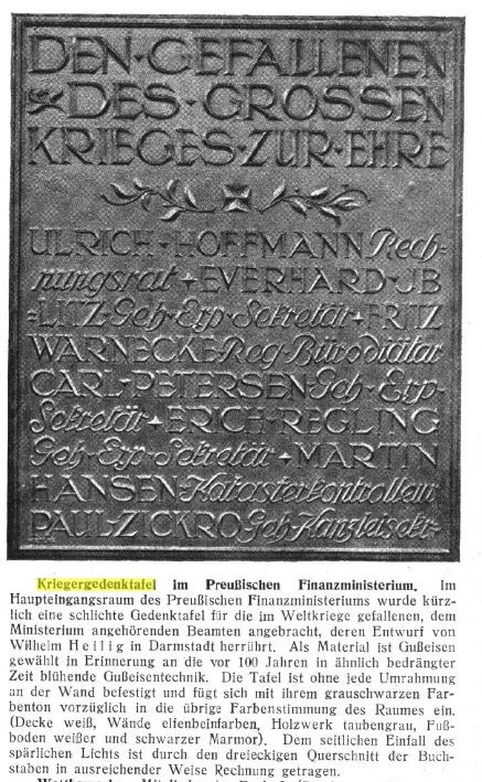 Im Haupteingangsraum des Preußischen Finanzministeriums wurde 1924 eine schlichte Gedenktafel aus Gusseisen für die im Ersten Weltkrieg gefallenen,