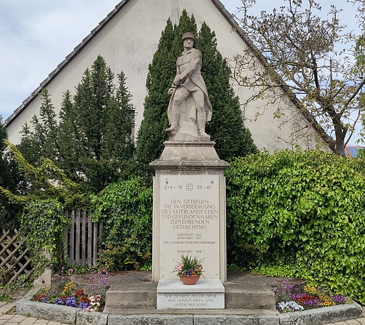 Die Statue eines Soldaten steht auf dem Denkmal für beide Weltkriege neben dem Rathaus.