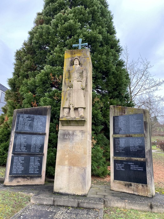 Die Gefallenen des Zweiten Weltkriegs wurden auf Schrifttafeln links und rechts der Stele angebracht.