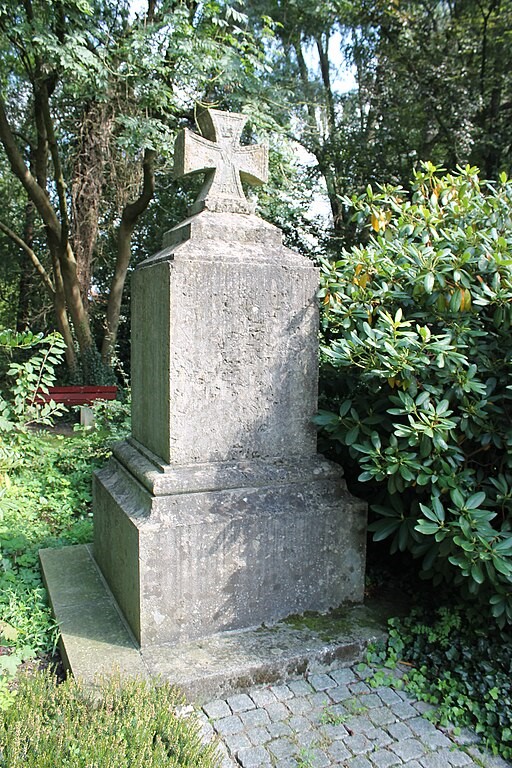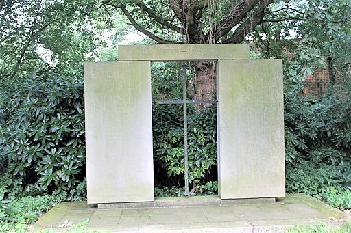 Drei Stelen für die Kriege Erster Weltkrieg (links), Zweiter Weltkrieg (Mitte), 1870-71 (rechts ohne Namen).
