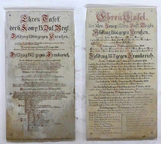 Zwei Gedenktafeln zweier Kompanien des bayer. 15.Infanterieregiments im nördlichen Eingangsraum der Hofkirche.