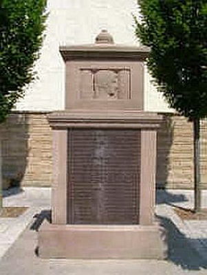 1. Weltkrieg: Dreistufige Sandsteinstele mit Verzierungen und Bronzetafeln.