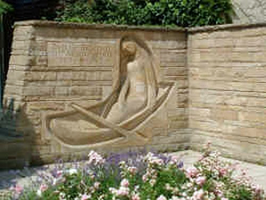 2. Weltkrieg: Helle Sandsteinmauer mit Namen und Relief: Trauernde Frau in einem Nachen sitzend.