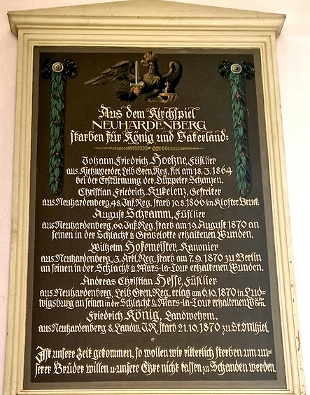 | Füsilier | HESSE | Andreas Christian | 06.10.1870 Ludwigsburg | Leib Gren.-Regt. | aus Neuhardenberg, starb an seinen erhaltenen Wunden in der Schlacht bei Mars-la-Tour |