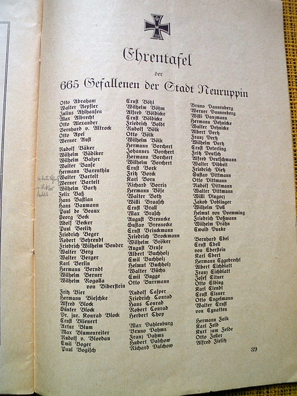 Gedenkheft mit den Namen der Gefallenen, ohne weitere Daten: Dr. Lampe, Neuruppin einst und jetzt, 1934, Verlag Willmann Magdeburg.