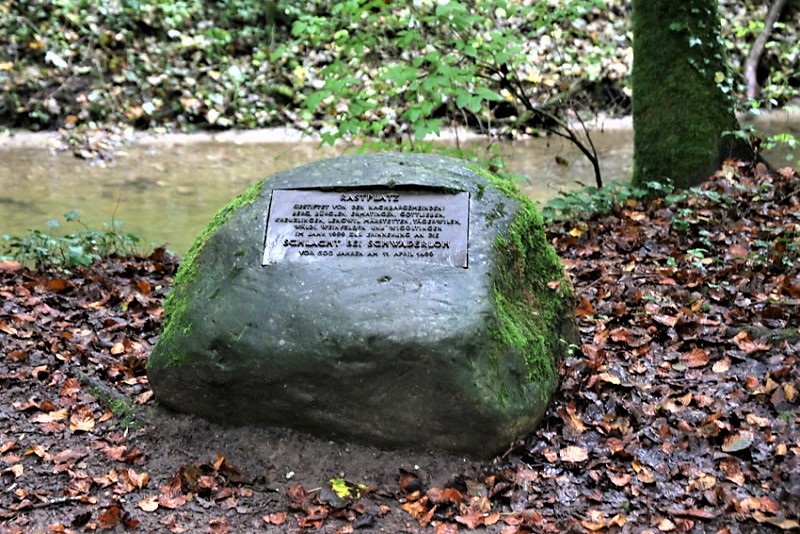 Am Jakobsweg (Konstanz-Einsiedeln) gelegen, Gedenkstein bei einem Rastplatz.
