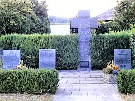 Auf dem Friedhof steht, von Büschen umrahmt, ein Steinkreuz, welches von drei Namensplatten flankiert wird.