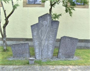 Denkmal bei der Kirche, linke Steinplatte mit den Namen des Ersten Weltkriegs und rechte Steinplatte mit den Namen des Zweiten Weltkriegs.