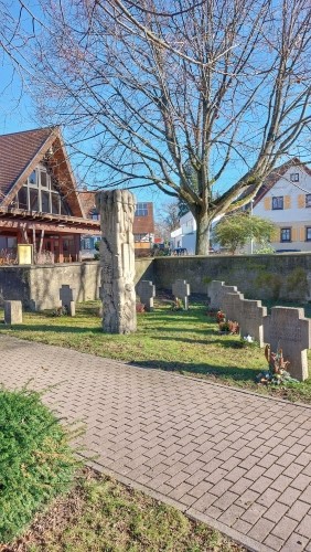 Auf dem Friedhof von Nußbaum steht eine vom Bildhauer Jean-Pierre Morlais gestaltete Gedenkstele, die am Volkstrauertag 1987 eingeweiht wurde. Um diese herum befinden sich neun Steinkreuze, die die Namen von Gefallenen und Kriegsopfern des Zweiten Weltkrieges tragen. Die Skulptur erinnert an die Opfer von Waffengewalt, Unterdrückung und Intoleranz in ihrer Gesamtheit, so der Künstler. In unmittelbarer Nähe ein Gedenkstein mit eingraviertem Eisernen Kreuz und mit den Namen von drei weiteren Gefallenen, einer davon unbekannt.