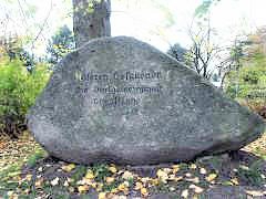Großer Findling mit Widmung, jedoch ohne Namen, aufgestellt auf einem Erdhügel unter einer Eiche.