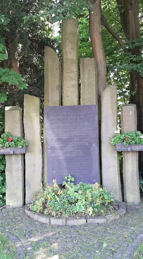 Modernes Denkmal am Dorfplatz in der Ortsmitte der Gemeinde Oberdreis für die Opfer beider Weltkriege.
