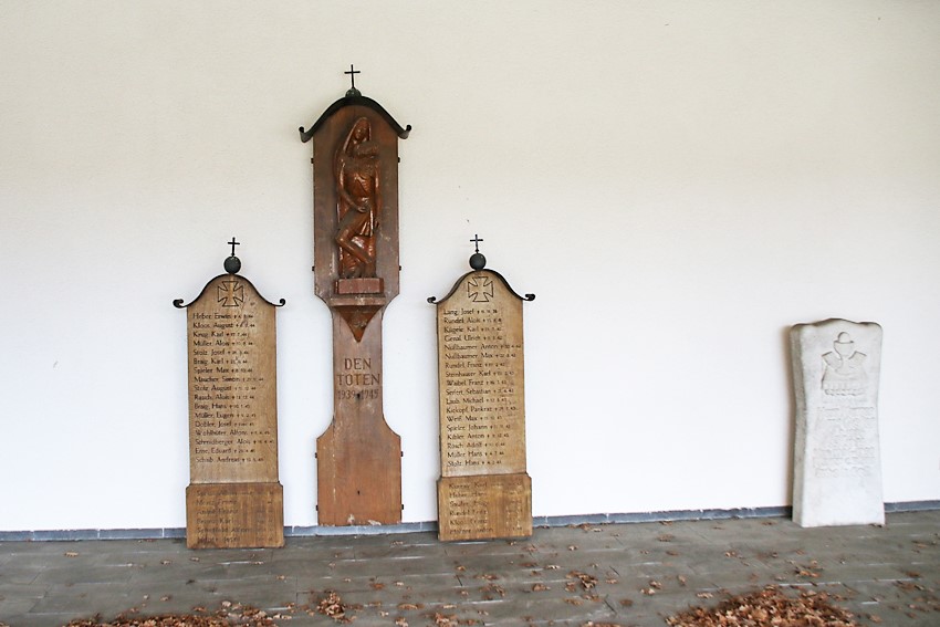 Denkmal an der Aussegnungshalle: In der Mitte Tafel mit einer Figur, seitlich Namenstafeln