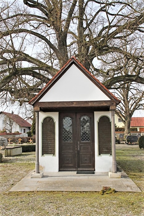 Gedenkkapelle im Friedhof und Daten von privaten Gedenksteinen.
