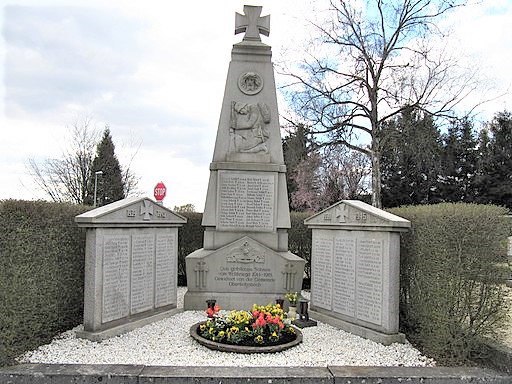 Gefallenendenkmal: Naturstein-Pylon mit dem Relief eines knienden Soldaten. Darüber sind das Bildnis Christi und ein Ehrenkreuz.