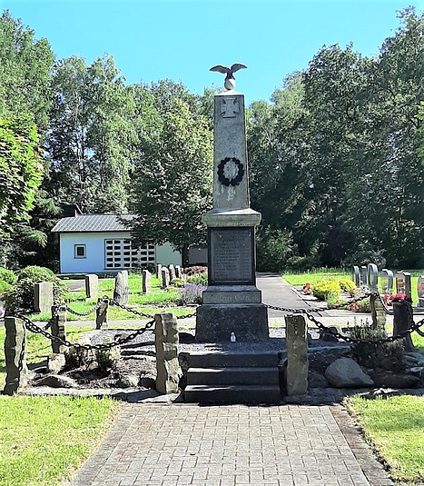 Friedhof: Steinsäule auf Sockel mit Namenstafeln, Adler auf Weltkugel.