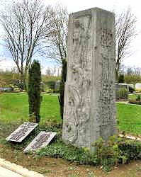 Vierflächige Stele mit Skulpturen und Inschriften auf jeder Seite, je eine Namenstafel für die beiden Weltkriege am Fuß der Stele.