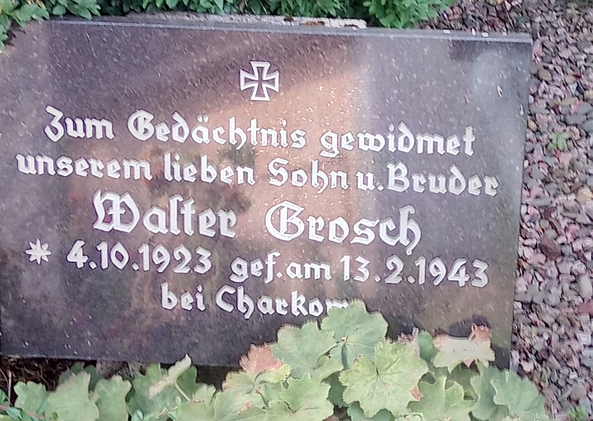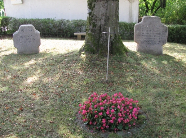 Gedenksteine in Kreuzform auf einer Grünfläche am Friedhof mit den Namen der Gefallenen und Vermissten beider Weltkriege.
