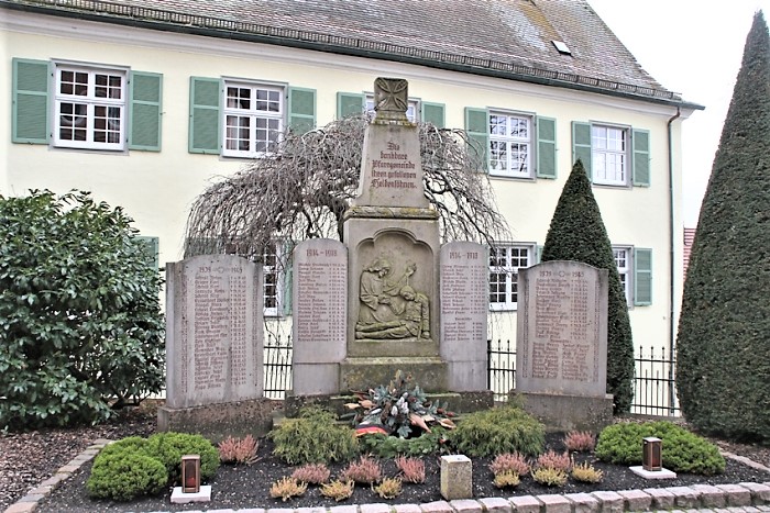 Rechts und links je eine Steintafel mit den Namen der Toten, flankiert von zwei weiteren Steintafeln (Zweiter Weltkrieg).