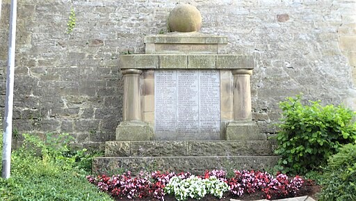 Kriegerdenkmal im Ortsteil Ottmarsheim. Schilfsandsteinmonument für die Gefallenen des Ersten und Zweiten Weltkriegs neben der alten Schule an der nördlichen Kirchenummauerung.
