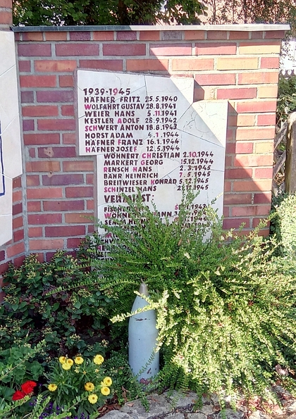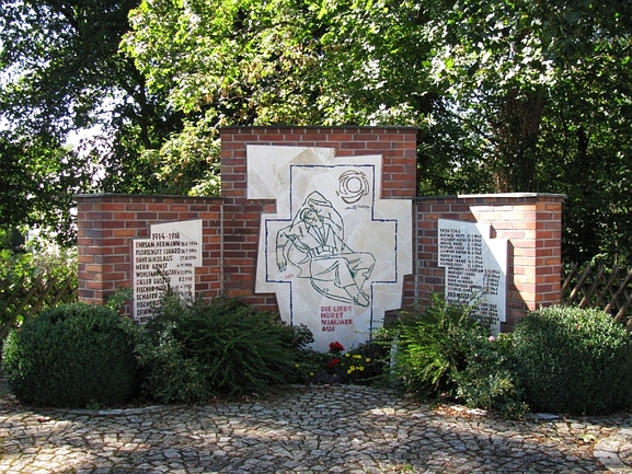 Steintafeln an einer Ziegelsteinmauer. Auf der linken Tafel die Namen mit Sterbedaten der Gefallenen und Vermissten des 1. Weltkrieges und auf der Rechten die des 2. Weltkrieges. Auf dem Mittelteil die Darstellung eines Gefallenen / Sterbenden, der von einer Frau gehalten wird. In der Bepflanzung vor der Gedenktafel für die Gefallenen des 2. Weltkrieges ist zusätzlich noch eine Granate aufgestellt.