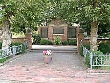 Ein mit Backsteinen gepflasterter Weg mit Metallornamentzaun gesäumt - zwei alte Bäume rechts und links - führt über drei Stufen zu einem mit einer Backsteinmauer umgebenen kleinen Platz. Am Eingang stehen rechts/links eine Backsteinsäule mit Kugel. Auf der Anlage steht eine Backsteinmauer, die dreigeteilt ist. Mittig erhöht mit gestuften Aufsatz, oben das Soldatenkreuz. Mittig auch verziert mit Blätterranke aus Sandstein, darunter ein Gedenktext, darunter in schwarzer Granitplatte die Namen der Opfer 1914-1918.