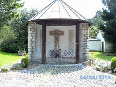 Überdachter Rundbau, mittig ein Steinkreuz auf einem Granitsockel mit Inschrift.