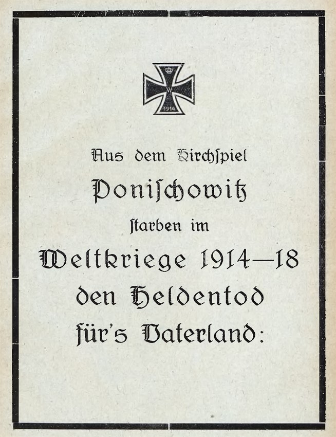Musketier | KAPITZA | Richard | 20 J. | Ponischowitz | 09.04.1916 vor Verdun |