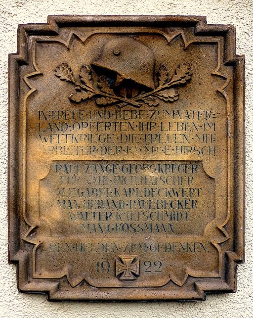 Gedenktafel für die im Ersten Weltkrieg gefallenen Mitarbeiter der Glashütte M. & E. Hirsch, Radeberg, Oststraße, eingeweiht 1922.